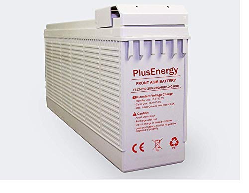 - Bateria AGM PlusEnergy FT12-250 12V 250AH: Voltaje: 12V. – Modelo: FT12-250 – Medidas: 560*125*316mm – Peso: 60 Kg. – Marca: PlusEnergy. – Tipo de batería: AGM. – Sin mantenimiento. – Más de 1500 ciclos según IEC 61427. – Capacidad en C100: 250Ah y en C10: 200Ah. – Garantia de 2 años. – Aplicaciones de Uso de la Batería: Telecomunicaciones, repetidores, instalaciones solares, baterías para uso en lugares cerrados.
