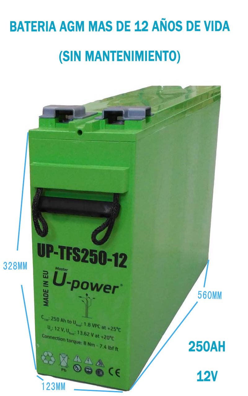 Tensión nominal: 12V Capacidad de 10 horas a 1,80 Vpc: 190 Ah Capacidad de 100 horas a 1,80 Vpc: 250 Ah Tensión de flotación: 02.27-02.29 Vpc a 20°C, 2,40 Vpc a 20°C Recarga Acelerada de acuerdo al manual de instrucciones Corriente de Cortocircuito: 3.165 Amperios Resistencia interna: 3,95 mΩ Especificaciones del producto: 12 años de vida aproximada, especificación EUROBAT Long Life Alto rendimiento en vida útil y flotación cíclica Tasa de autodescarga baja Baja resistencia interna Amplio rango de temperatura de funcionamiento -20°C a + 55°C Diseño compacto con alta densidad de energía Integración en rack ETSI Válvula reguladora unidireccional con sistema anti incendios Eficacia de recombinación de gas interna 98% – 99% Bajo coste de instalación, sin mantenimiento de uso Se entrega listo para su uso Contenedor ignífugo retardante resistente a golpes ABS Sellado y libre de fugas Terminales de latón hembra M8 sin necesidad de volver a apretar Batería AGM no peligrosa para el transporte por avión, tierra o mar. Producto totalmente reciclable. Características mecánicas: Longitud: 555 mm Ancho: 125 mm Altura: 320 mm Peso: 59,2 kg Terminal: 8,0 Nm