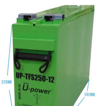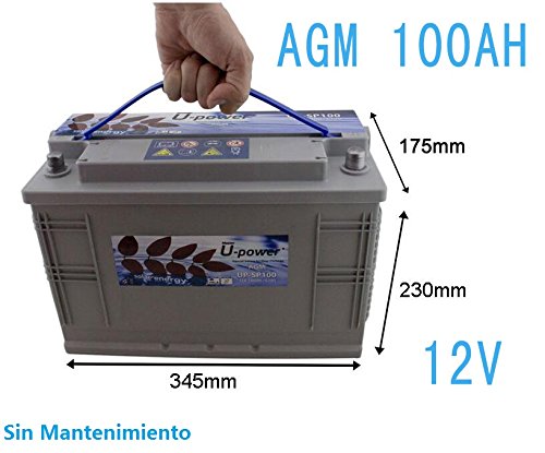 • Voltaje: 12V. – Medidas: 513 x 189 x 223 mm. – Peso: 39 Kg. – Marca: U-Power. – Tipo de batería: AGM. – Sin mantenimiento. – Más de 500 ciclos a 75% D.O.D. Más de 1000 ciclos según IEC 61427. – Capacidad en C100: 160Ah y en C10: 130Ah.